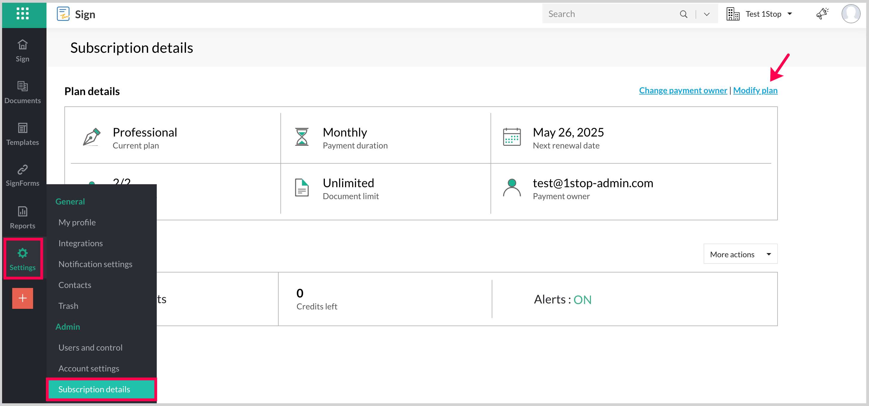 1. In Zoho Sign, navigate to Settings > Subscription Details, then click Modify plan.