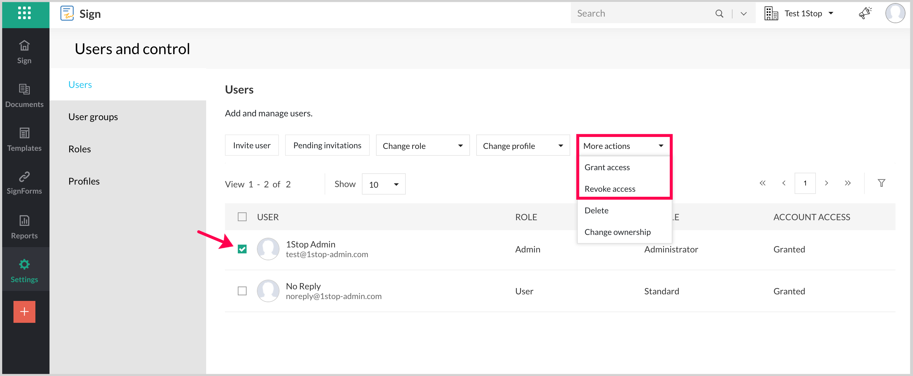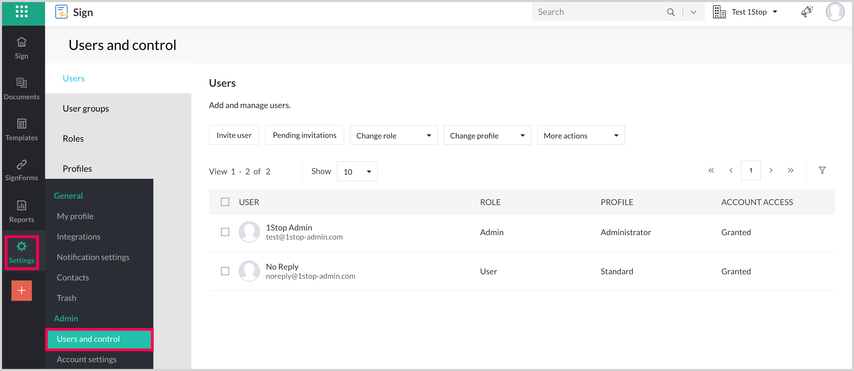 1. Go to sign.zoho.com. Navigate to Settings > Users and Control.