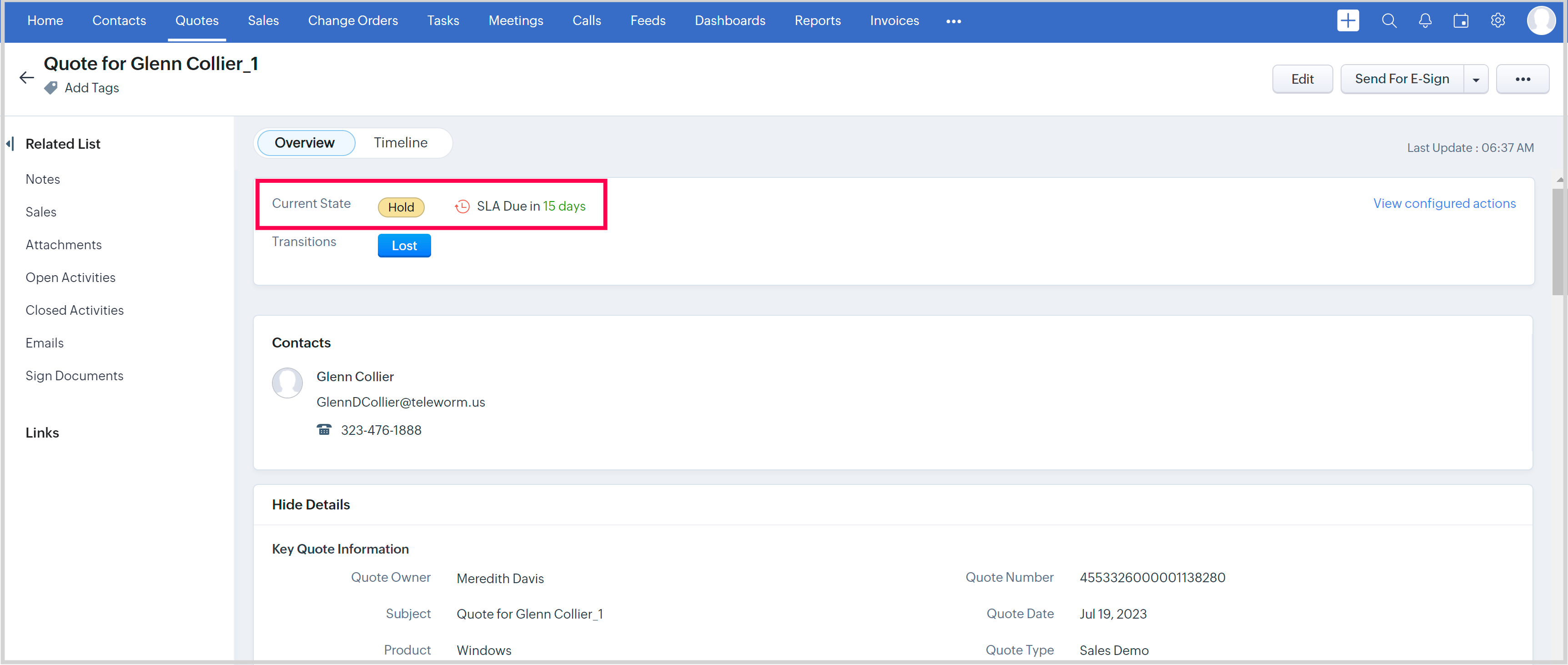 After a Quote is placed on Hold, 1Stop will auto-move this Quote to Lost in 15 days from the date it was moved to Hold. You can see how many days remain in the the Hold State by reviewing the "SLA Due in # days," which is located to the right of the Current State at the top of the Quote record.
