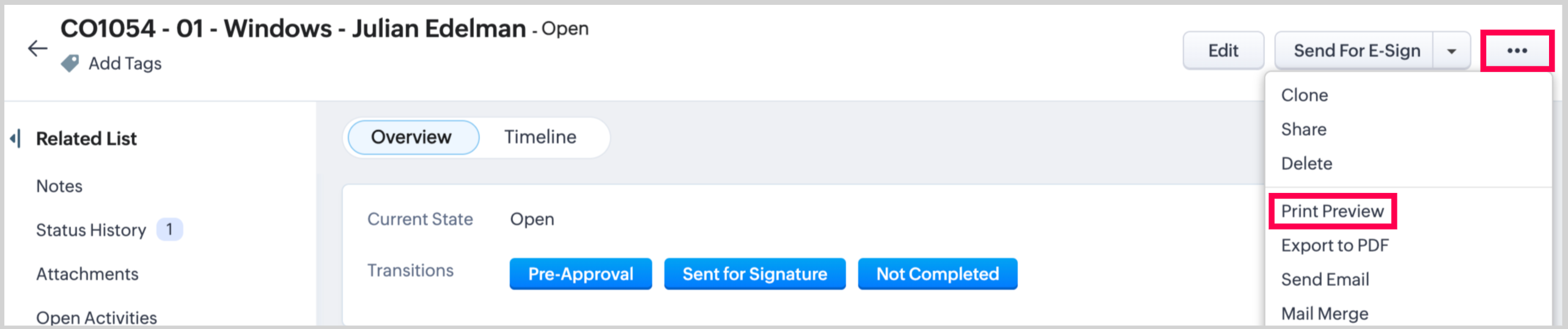 1. Click the More button (3 dots) on the top right of the Change Order Record. Select the Print Preview option.