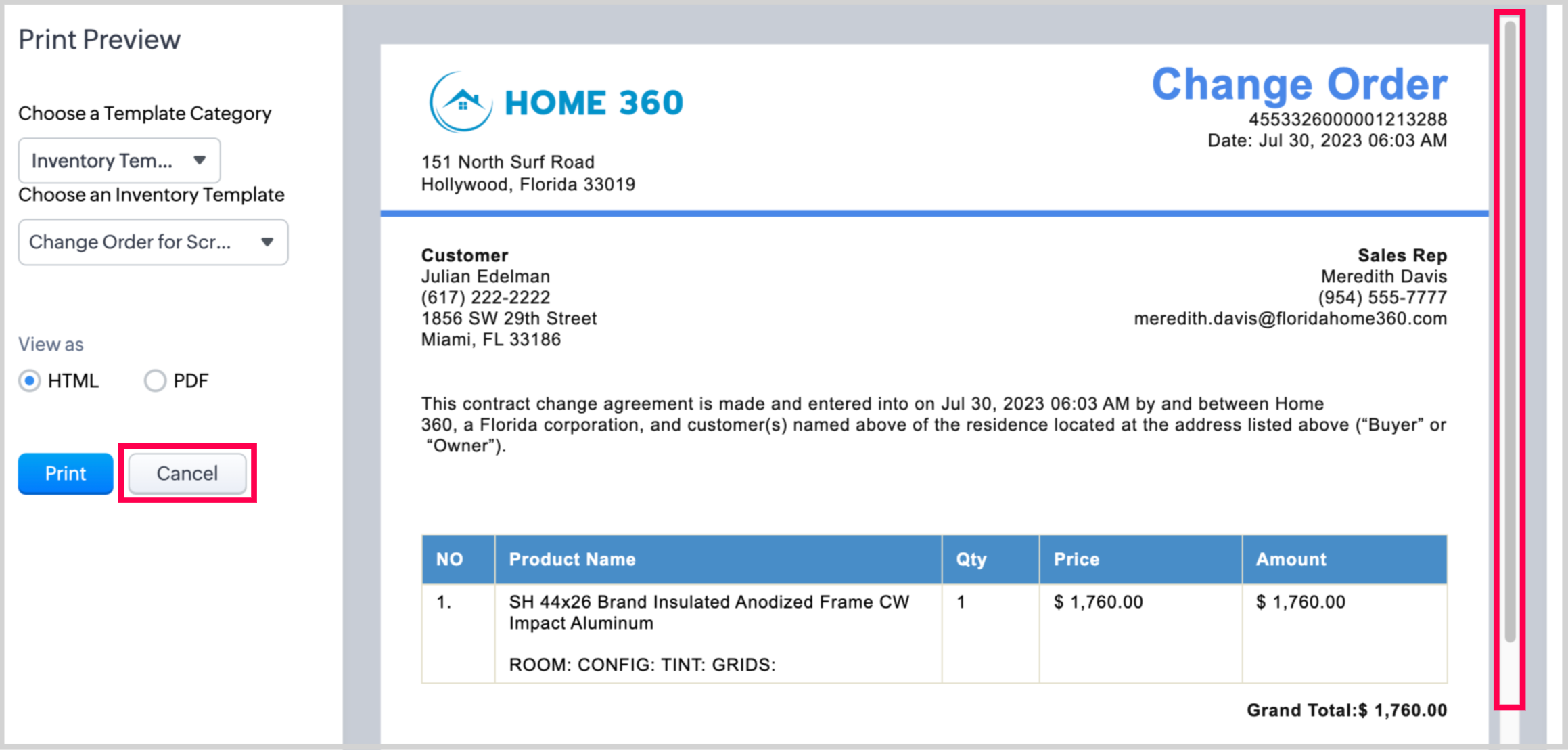 Before sending a Change Order for digital signature or via email as an attachment, you should always preview the Change Order to ensure the Template is populated accurately based on the information in the Change Order Record.