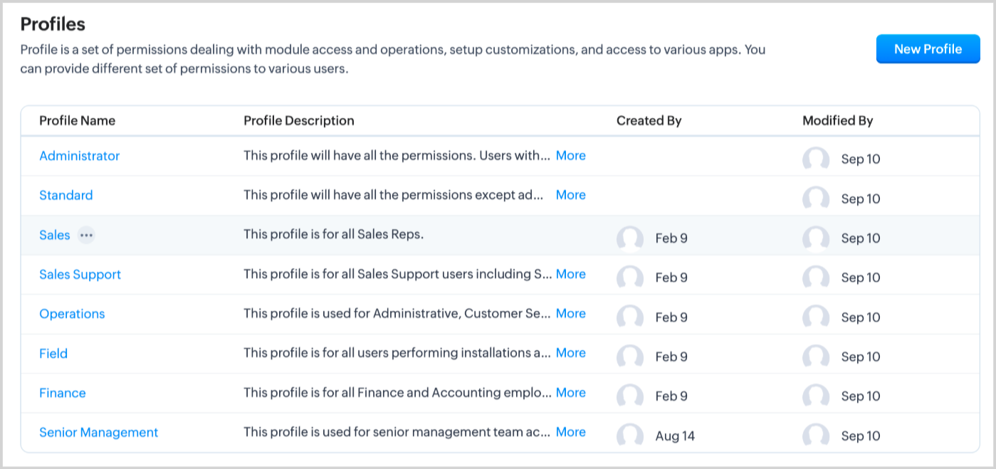 - Profiles - See Profile Management to learn how to create profiles and manage profile permissions.