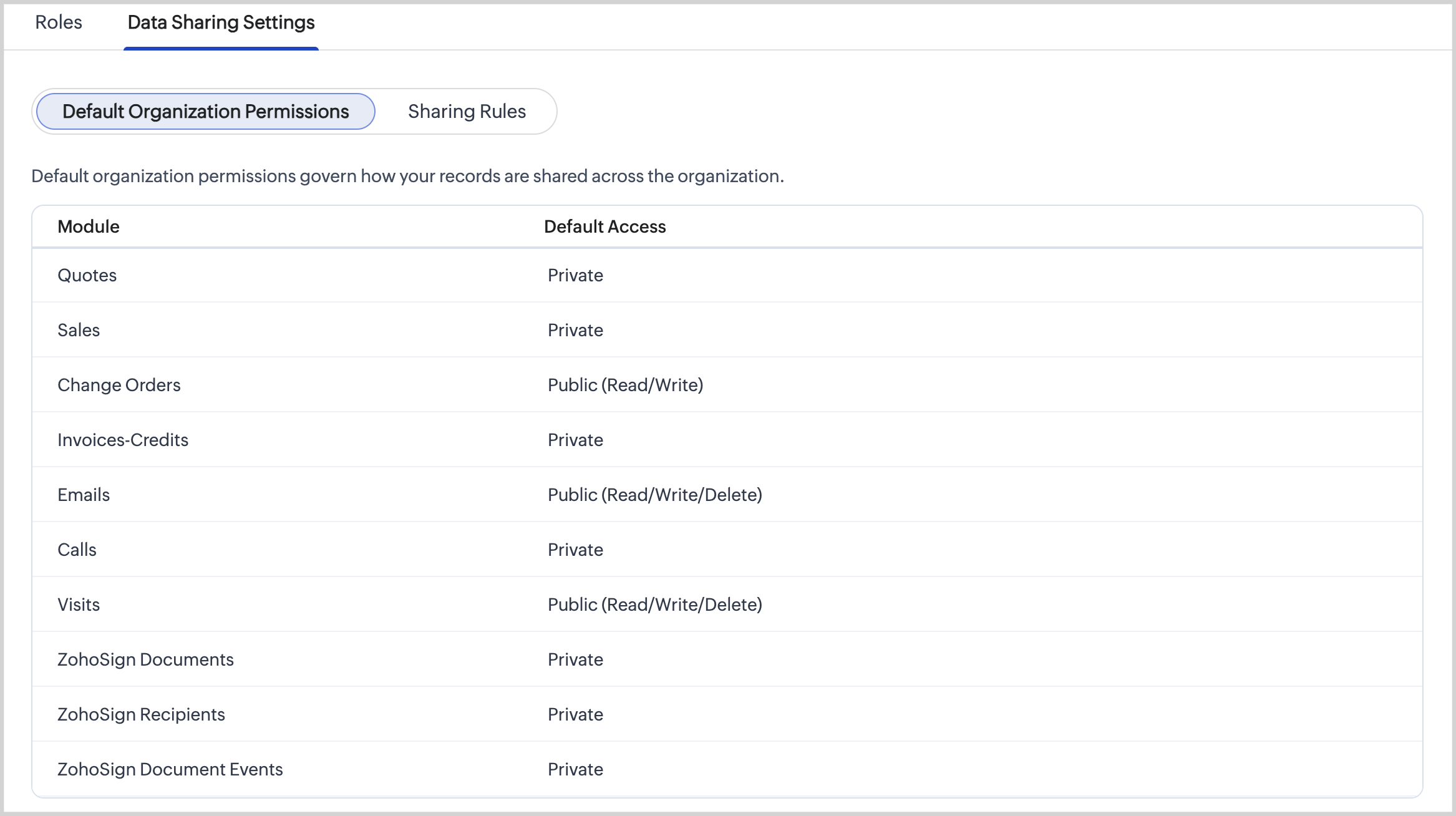 Sharing rules can be set for different modules (like Contacts, Quotes, or Products), giving your company flexible control over who sees what.