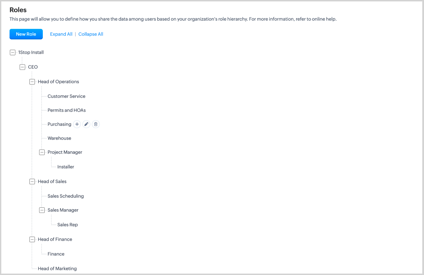 A Role is akin to a job title or position you've been assigned, and it determines your position within the company's hierarchy. This is crucial for data sharing purposes. For example, based on their role, a Sales Manager can view all records owned by Sales Reps who report to them, but individual Sales Reps cannot view each other's records. 1Stop comes with pre-configured Roles accessible by your administrator.