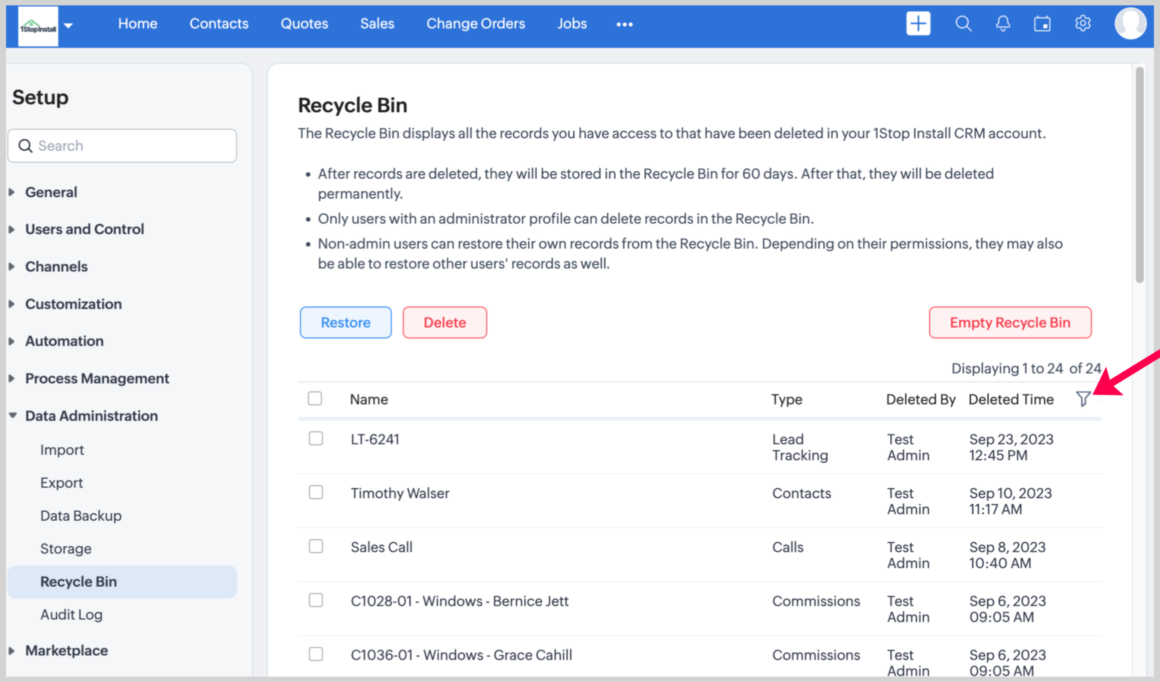 1. In the Recycle Bin, click the Funnel Icon in the list view header.