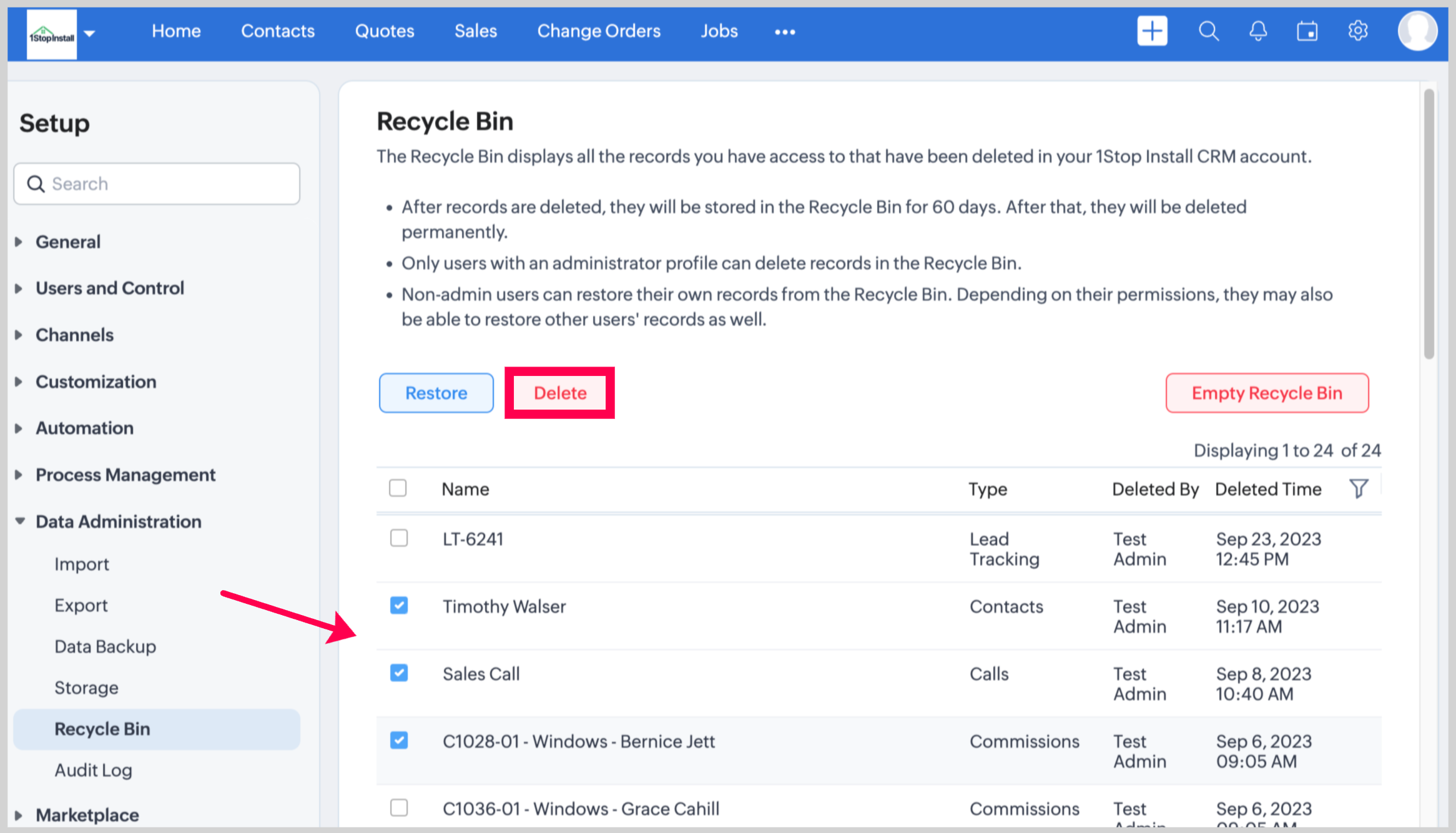 2. In the Recycle Bin, select the checkboxes of the records you want to permanently delete, and then click Delete.