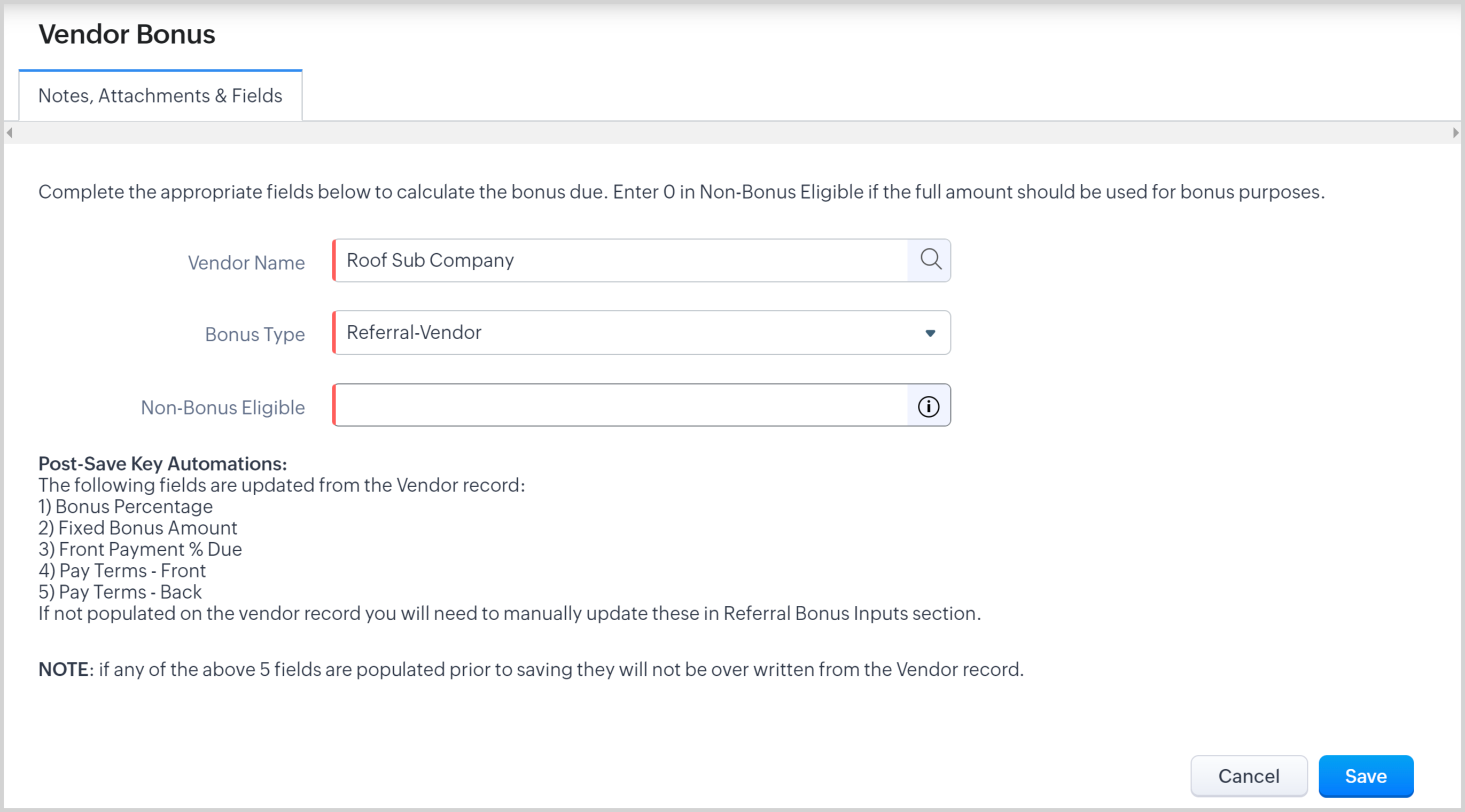 - Bonus Type - This field should be set to "Referral-Vendor."