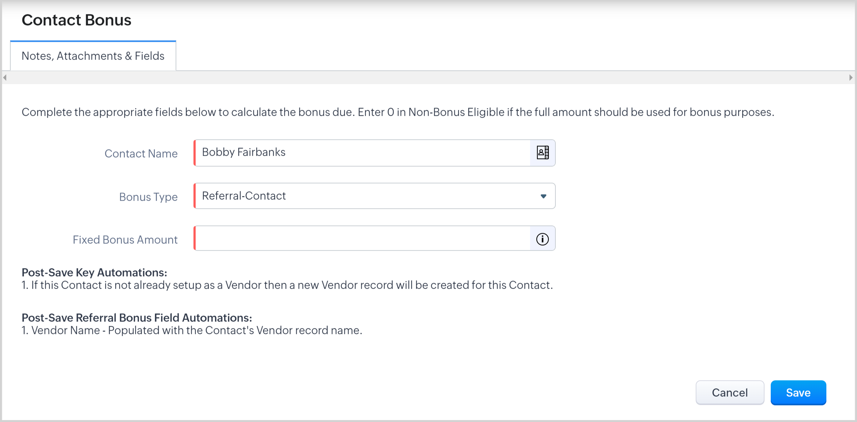 - Fixed Bonus Amount - This field represents the $ amount that the contact should receive as their referral bonus. If there is no Fixed Bonus Amount due then enter 0.