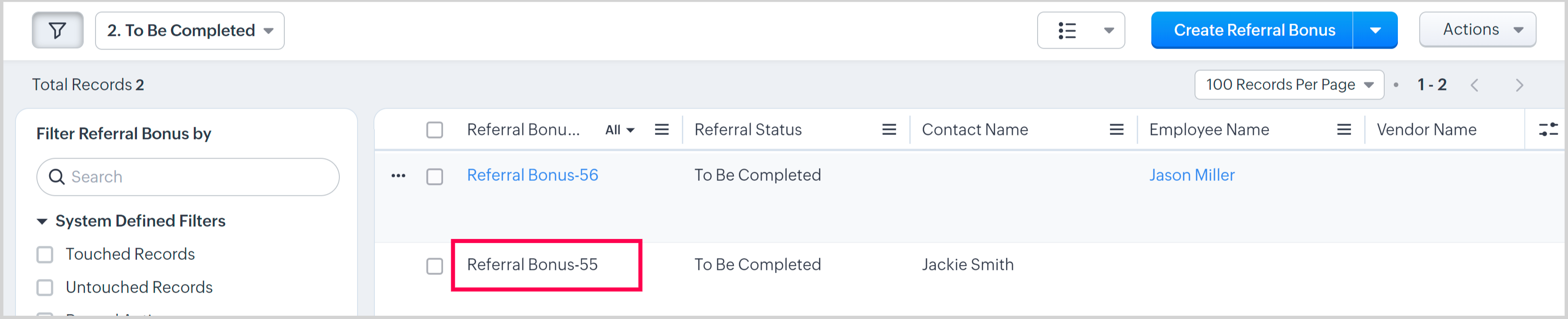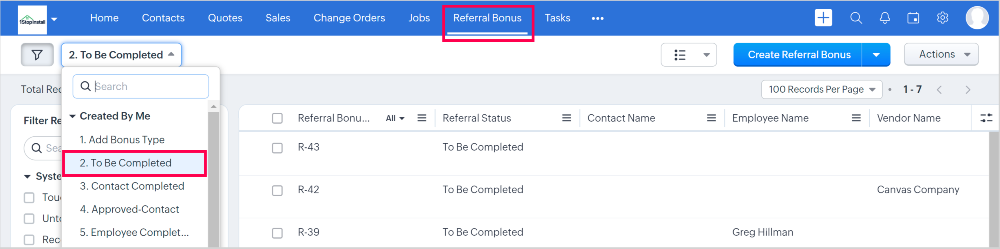 1. On the Referral Bonus Module, select the "2. To Be Completed" Custom View.