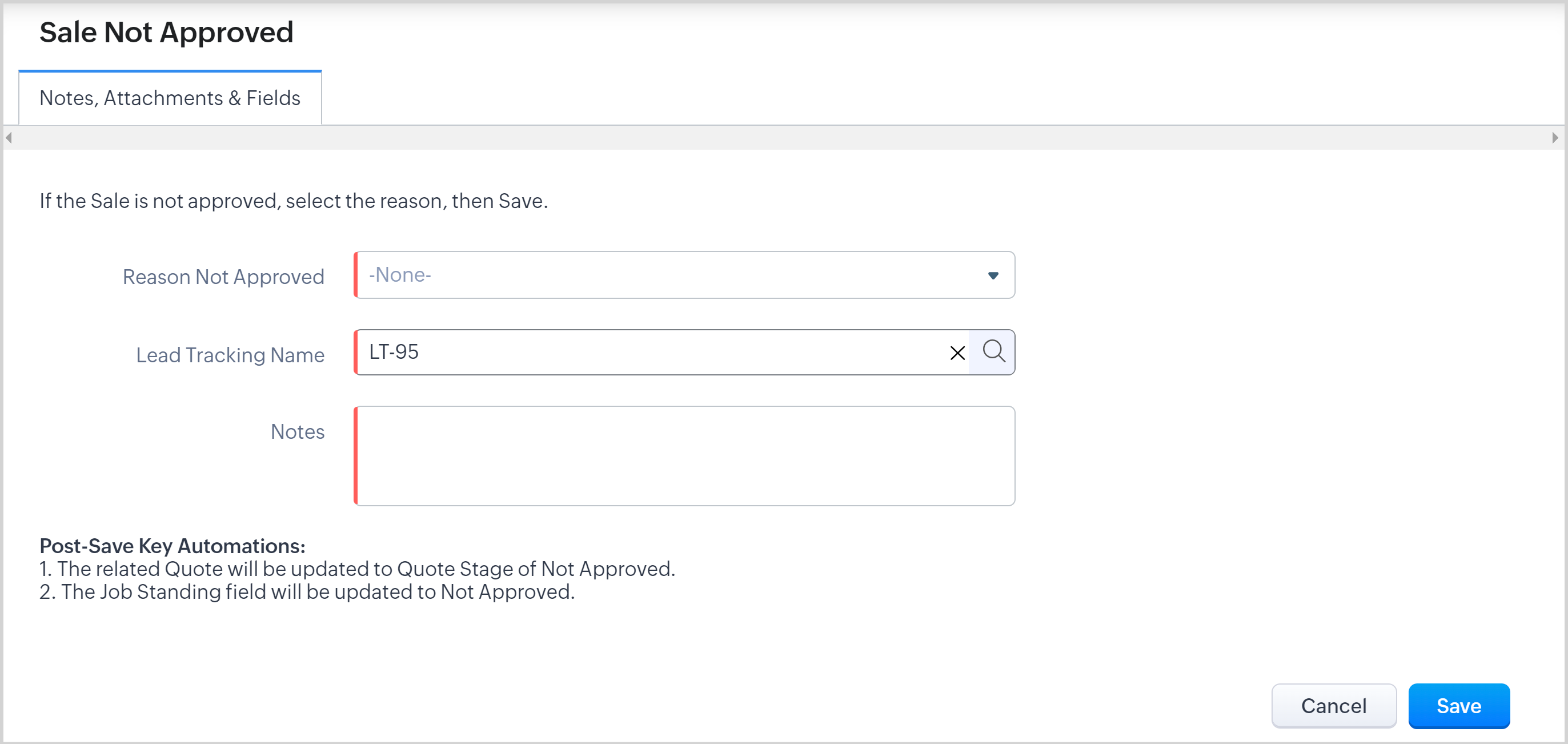 1. To not approve a Sale, click the Sale Not Approved Transition on the Sale Record.
