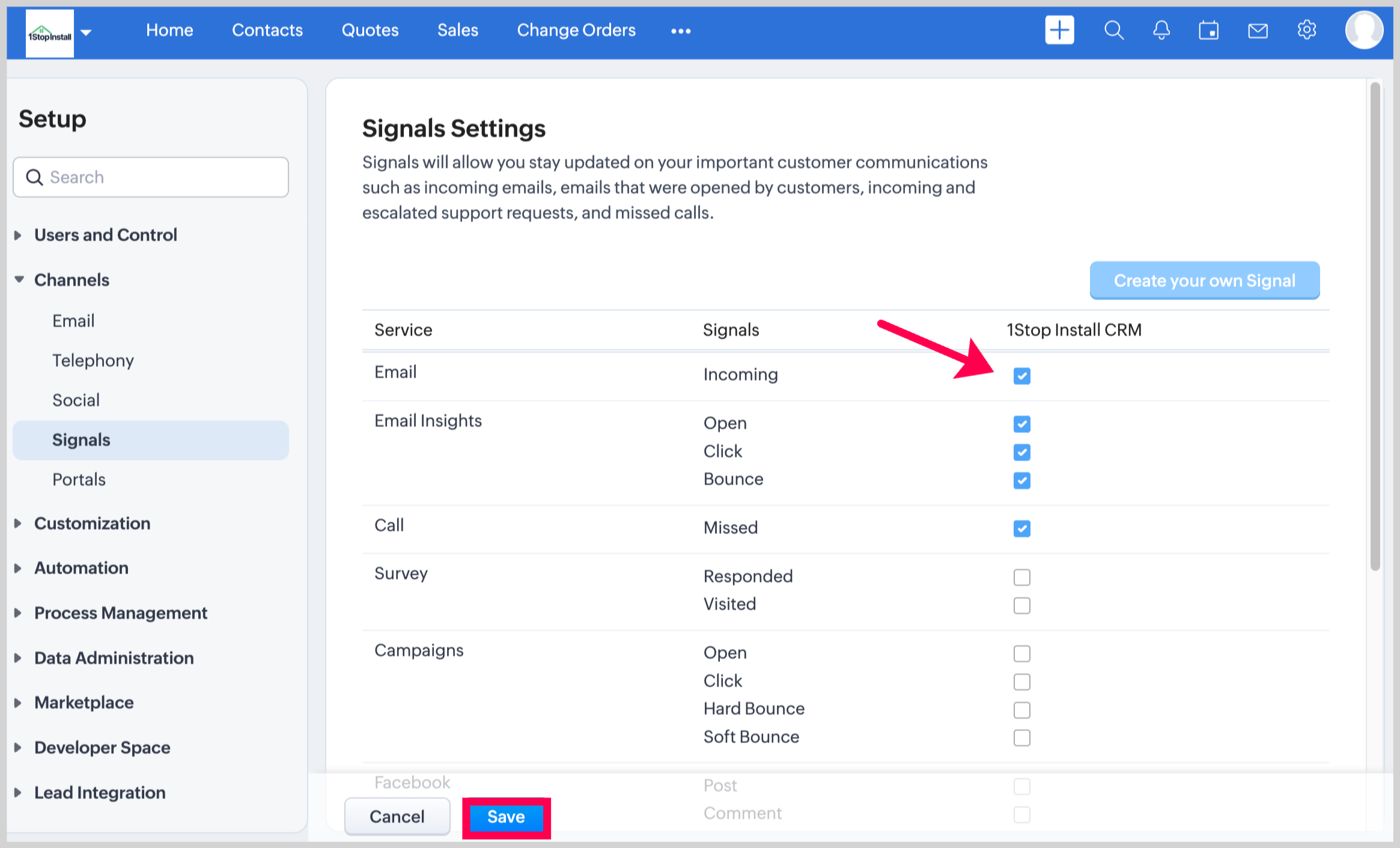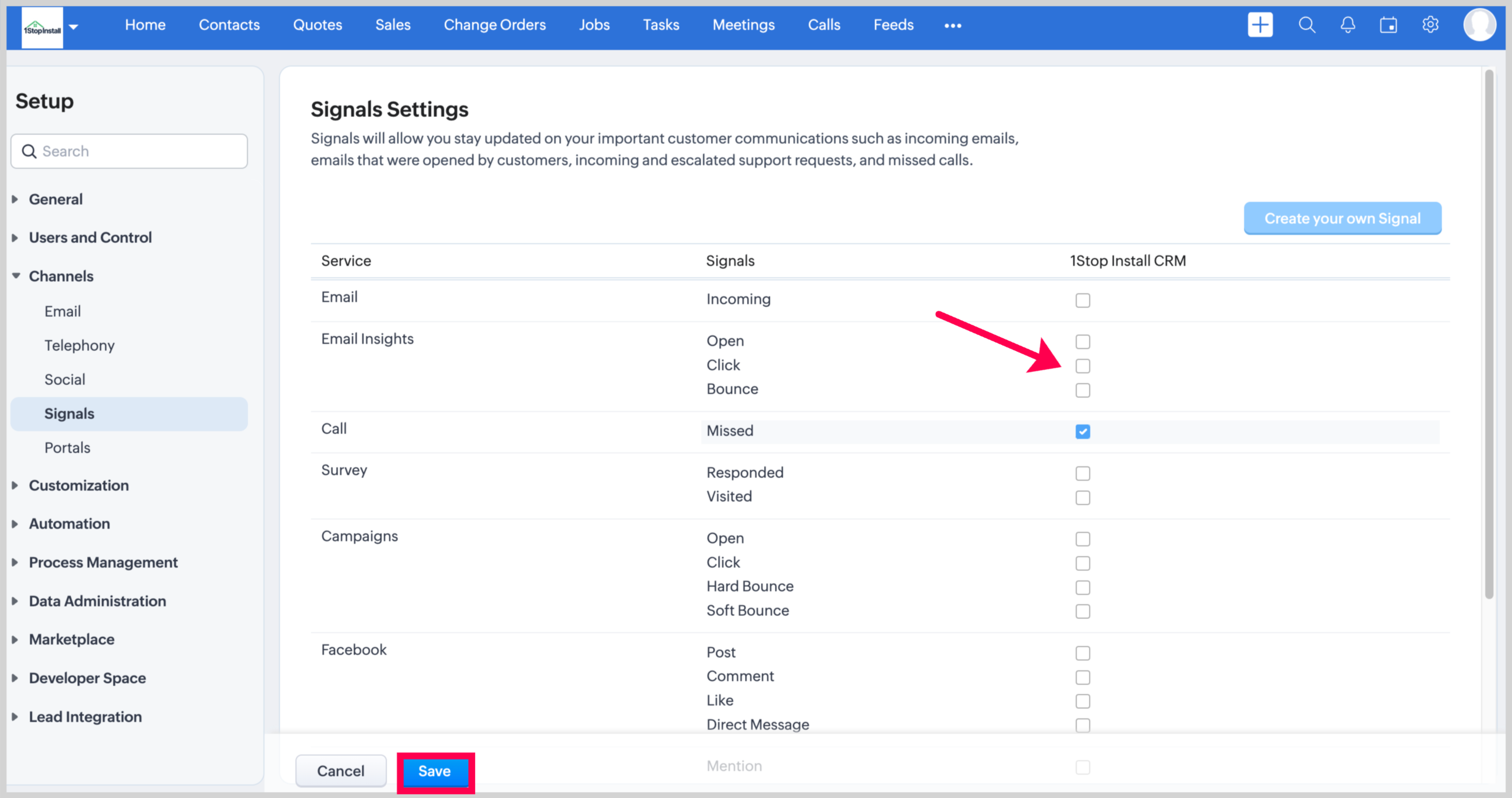 You can only enable Signals when the respective app/channel is already integrated with 1Stop Install CRM.