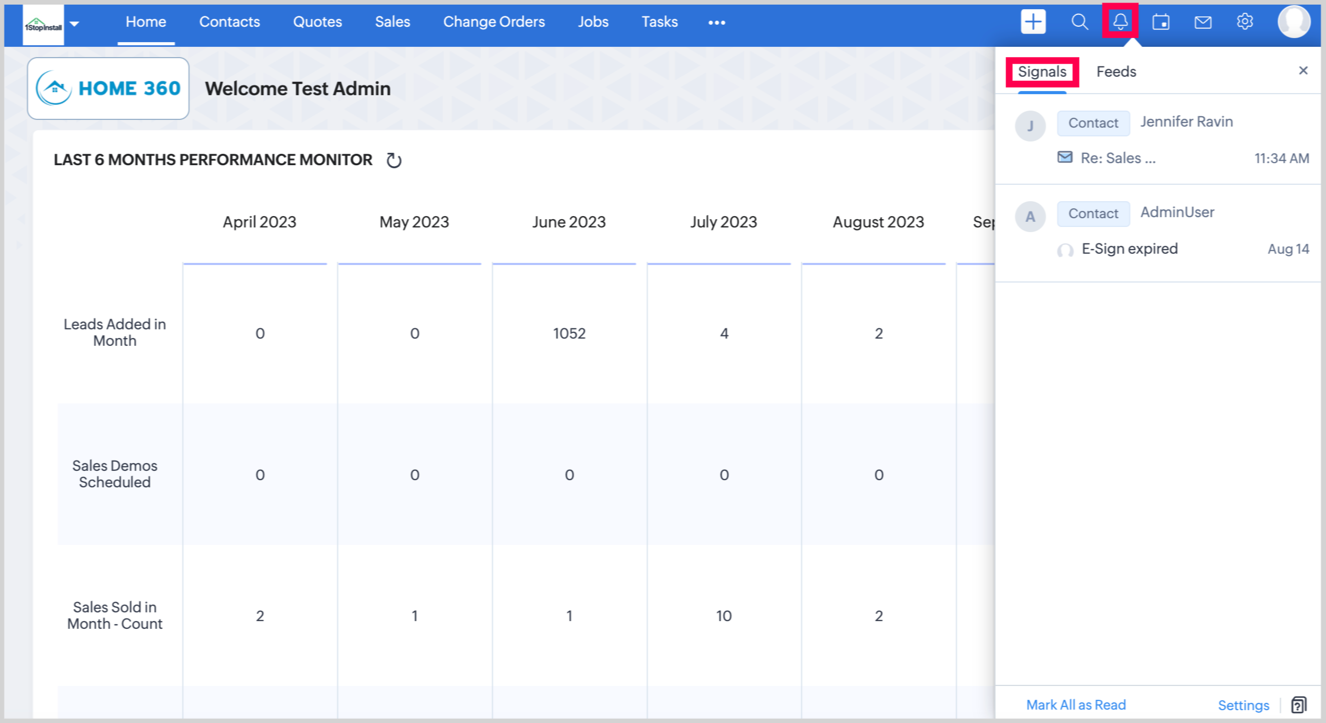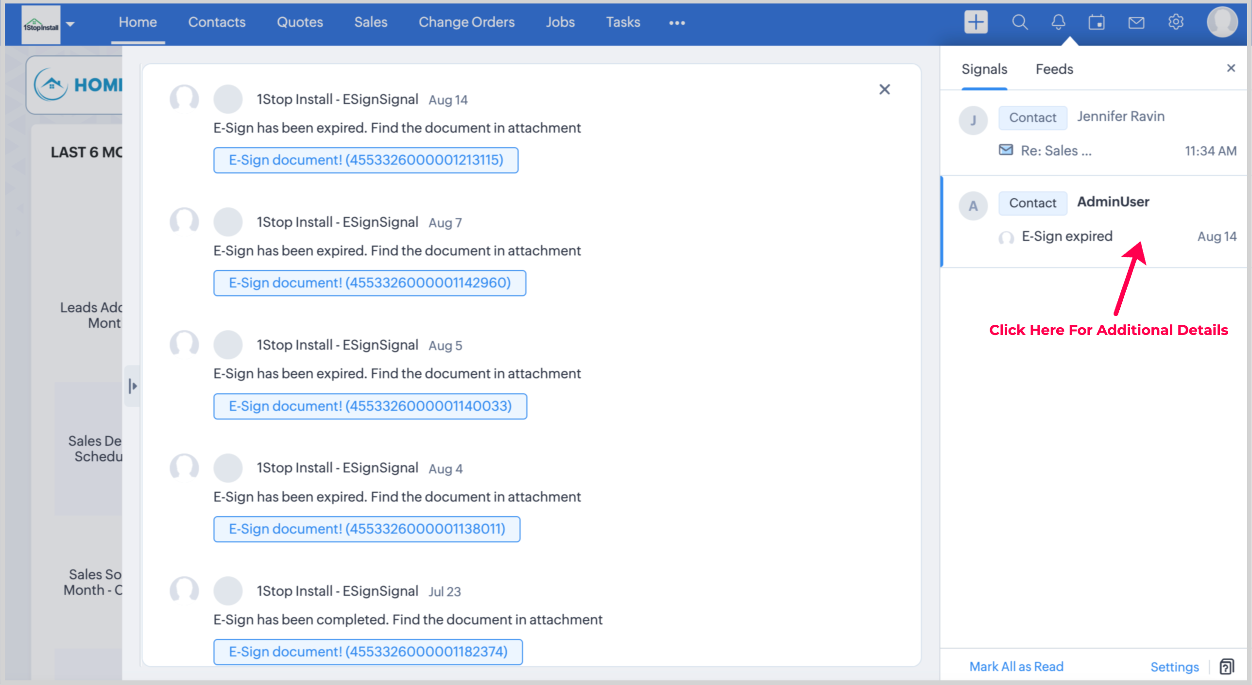 ) on the top-right corner of the 1Stop Install CRM home page. You can identify the Signal type based on the icon displayed below the lead or contact's name and view them.