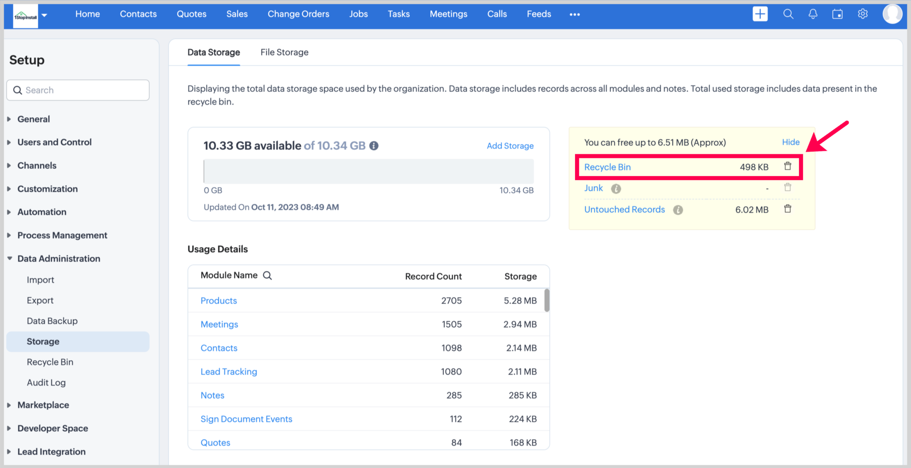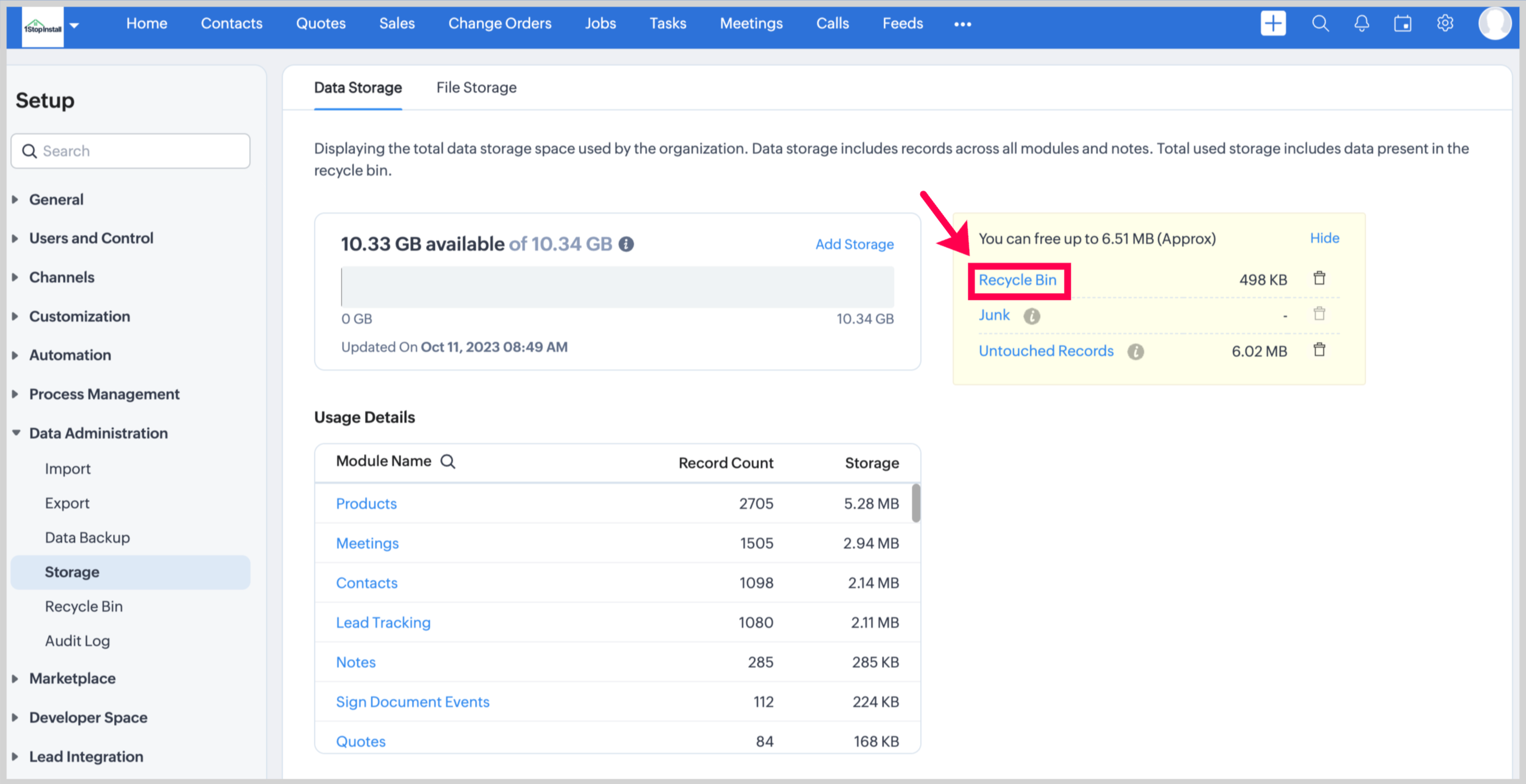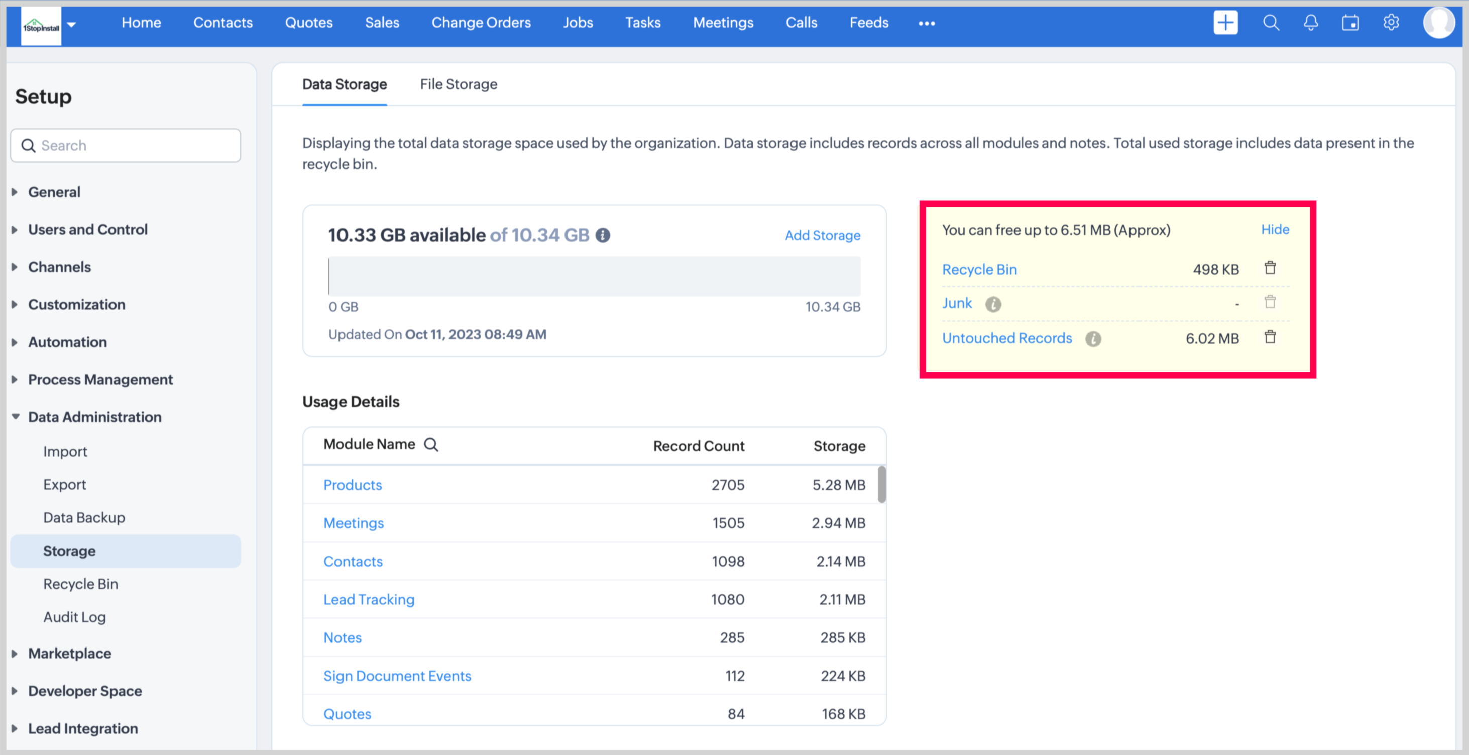 This includes the total storage space taken up by records from both standard and custom modules, including any attached notes. It also accounts for the storage space occupied by data within your recycle bin.