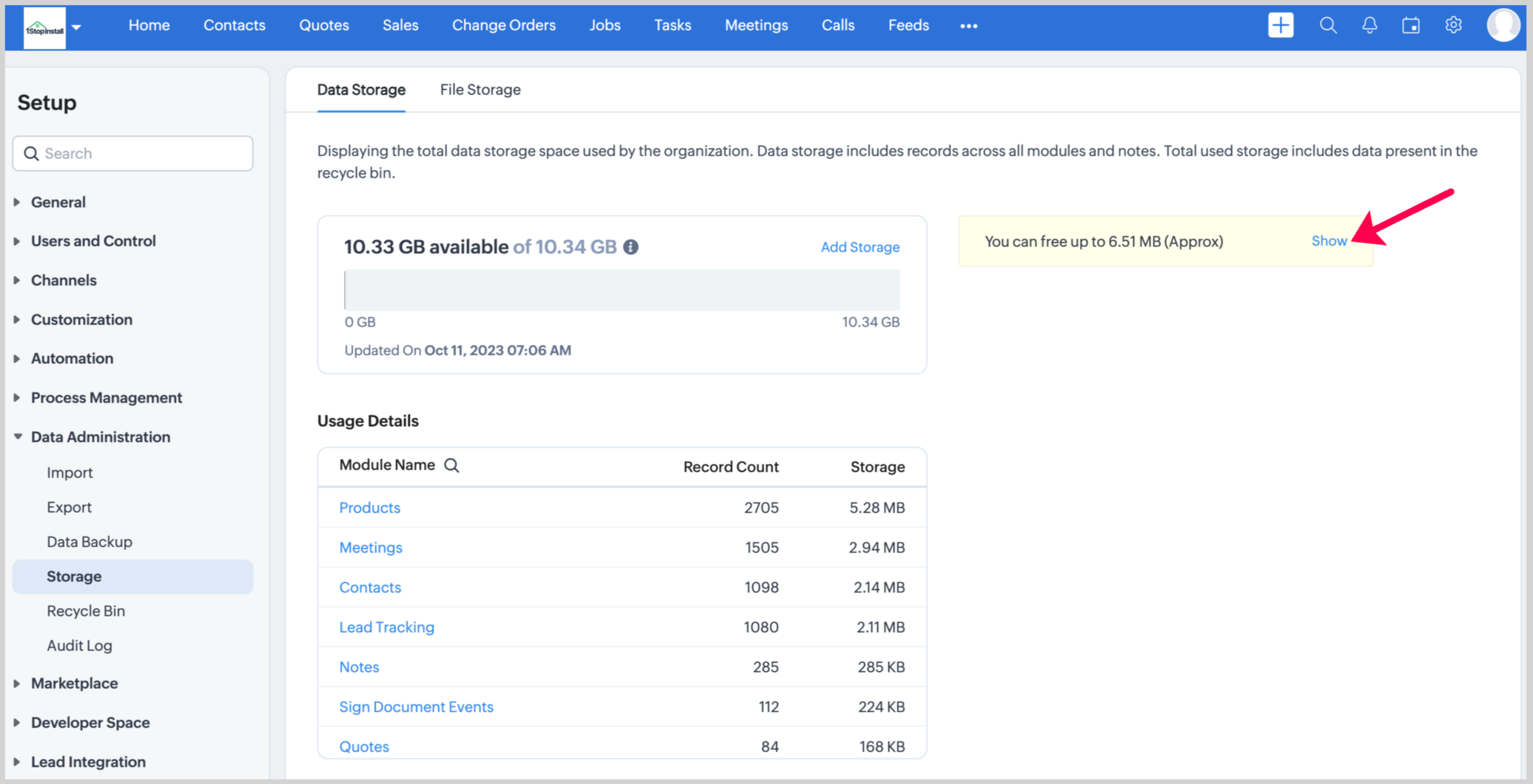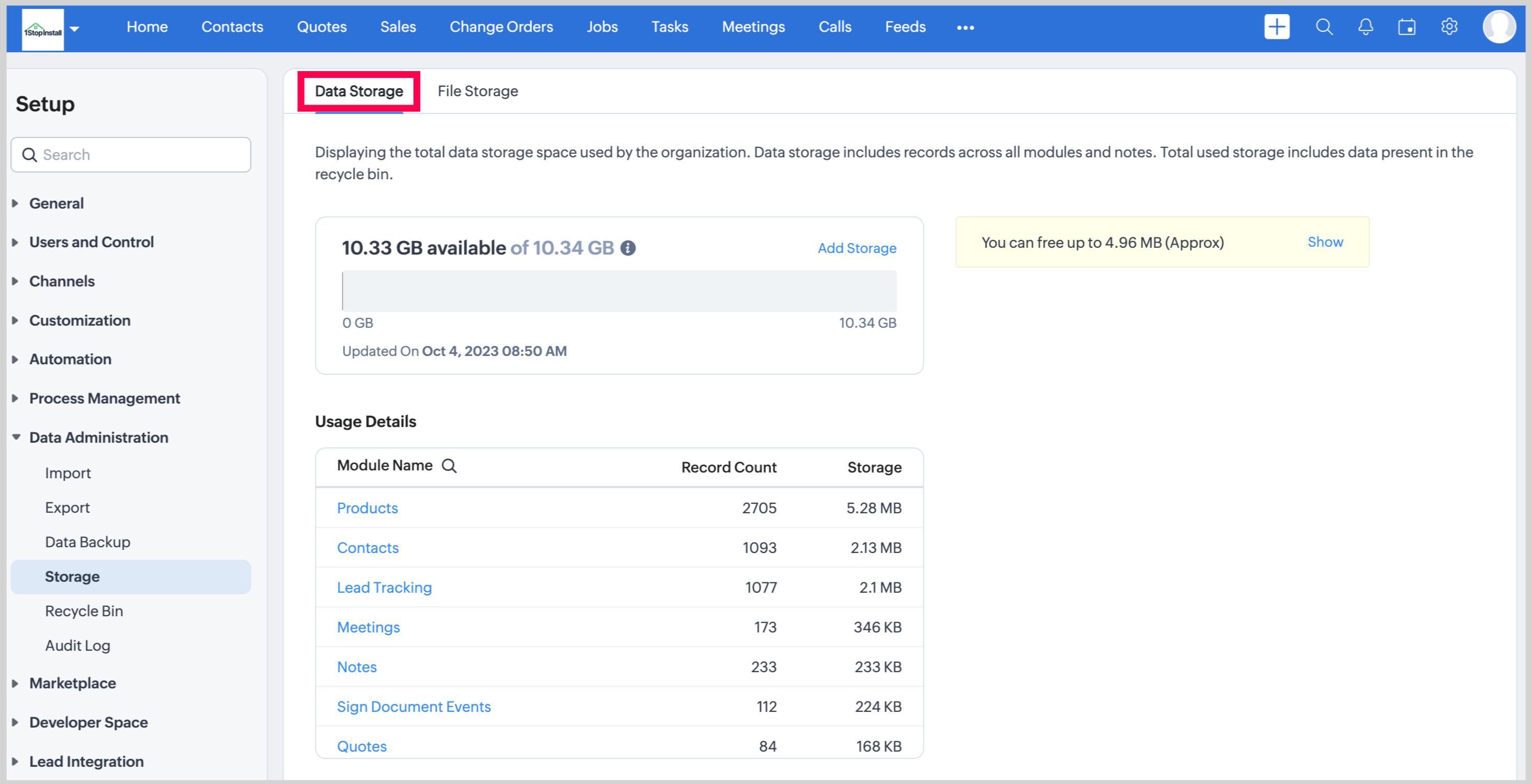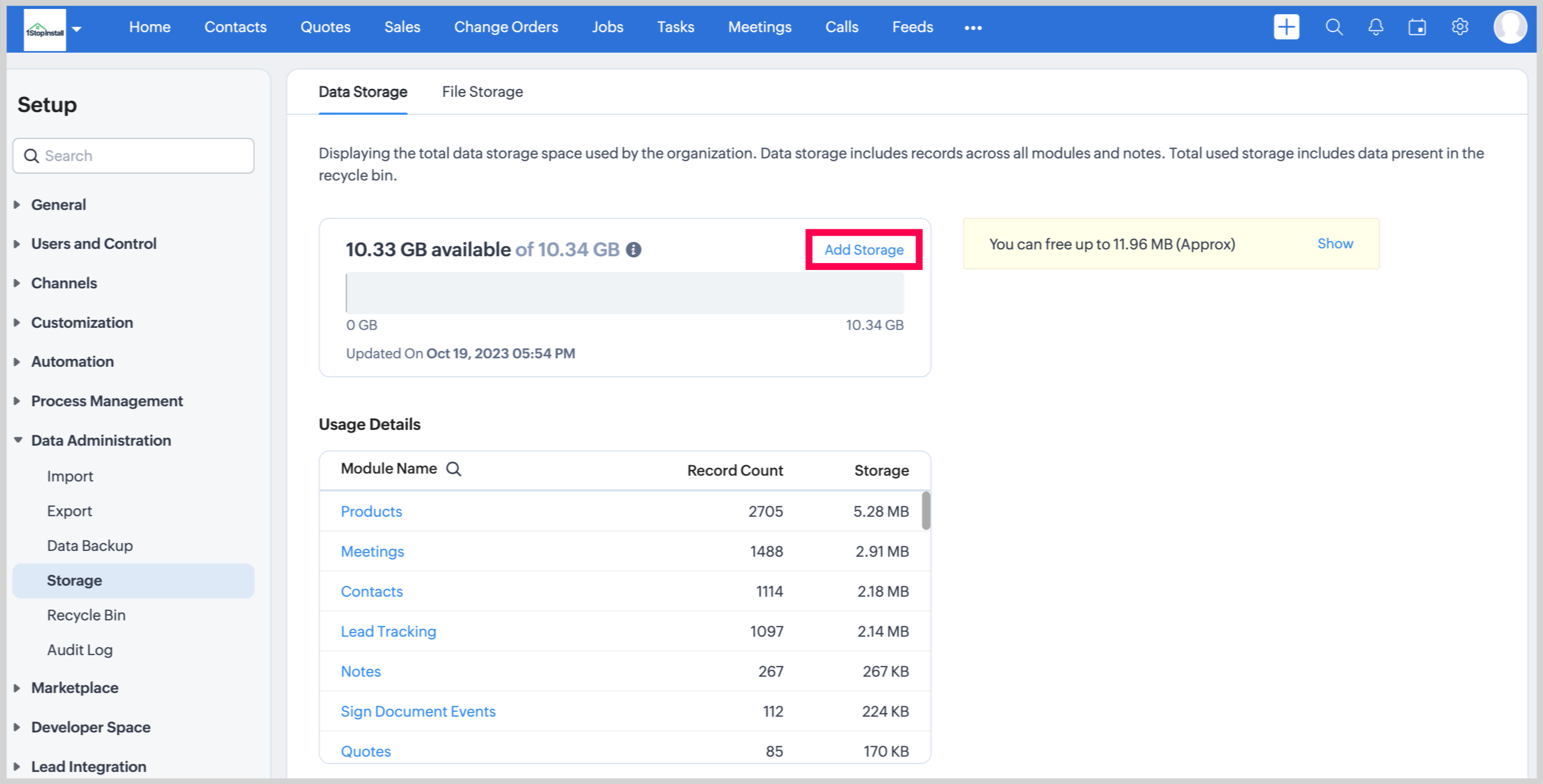 This includes the total storage space taken up by records from both standard and custom modules, including any attached notes. It also accounts for the storage space occupied by data within your recycle bin.