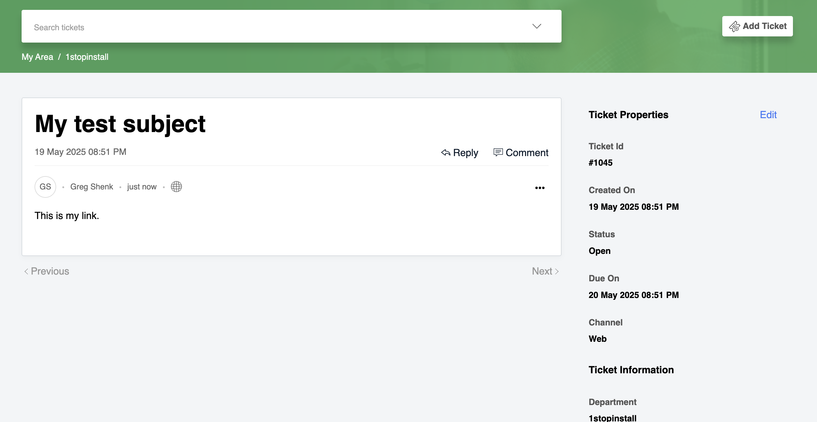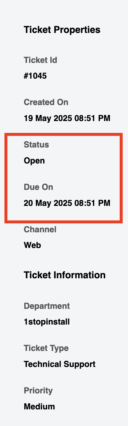 After submission, you'll be redirected to the Ticket Information page. From here, you can monitor the status, view the Due On date (expected resolution date), or reply to the support team.