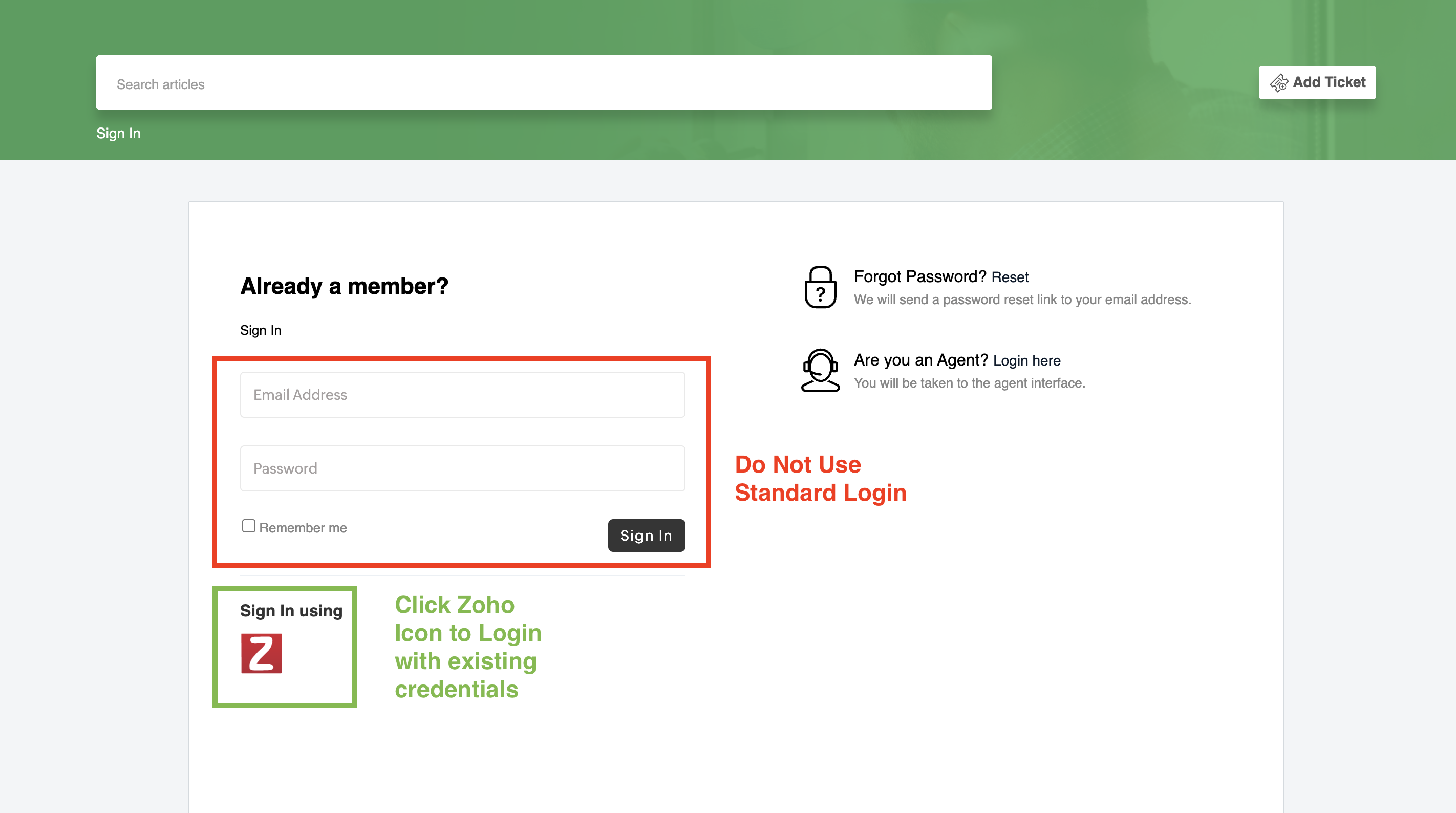 - Click the red Zoho icon (Z) to sign in using your existing 1Stop credentials ⚠️ Important: Do not use the email address and password fields. You must click the Zoho icon to sign in successfully without creating new credentials.