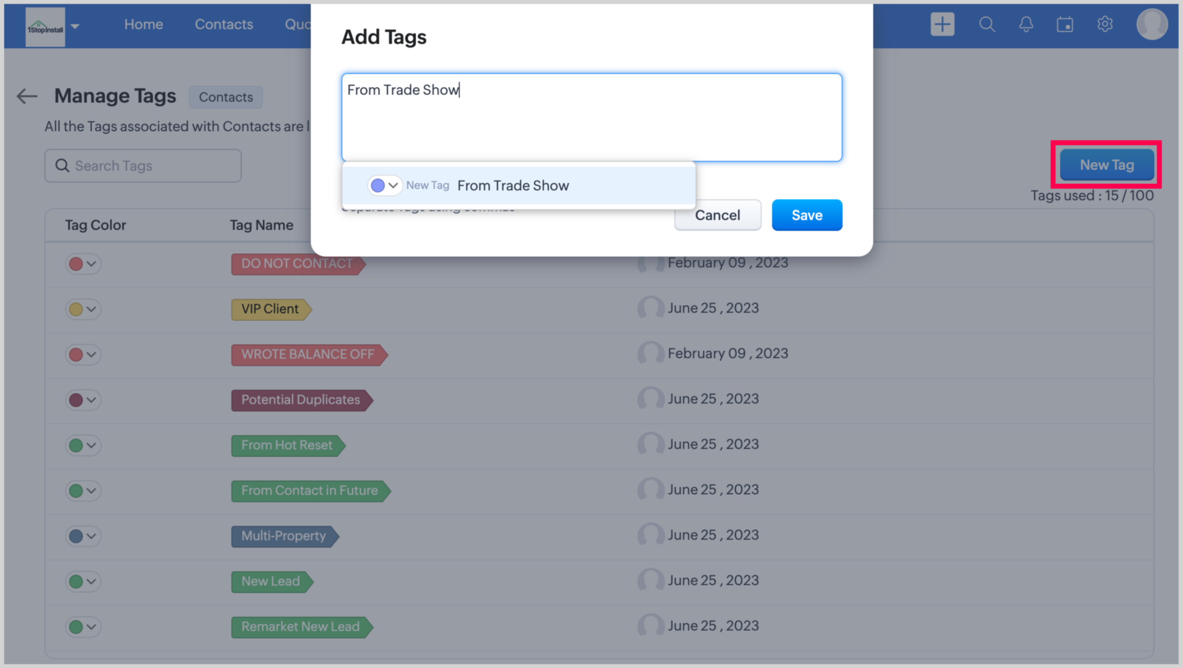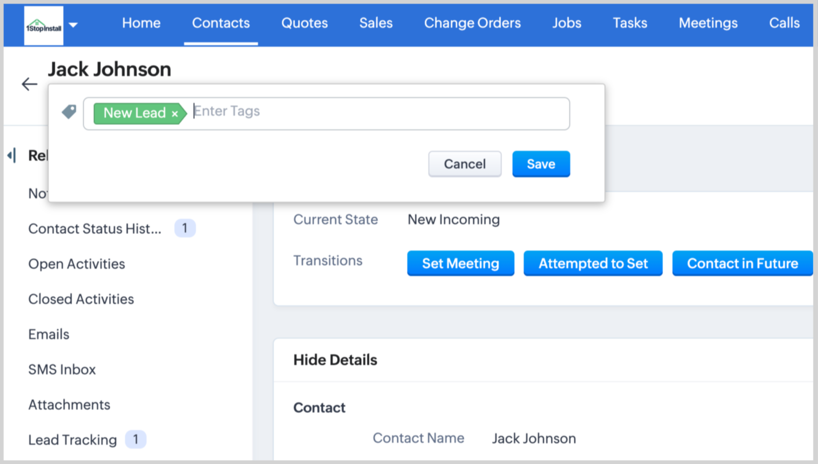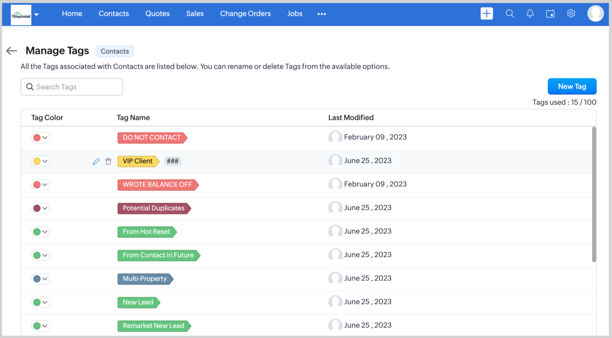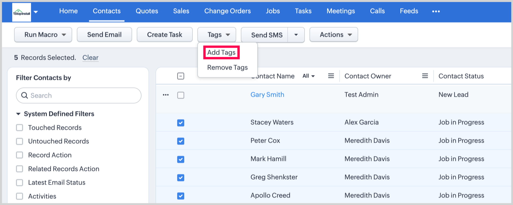 1. Log into 1Stop, and navigate to the module where you intend to the add Tags (Contacts, Quotes, Sales, etc.)