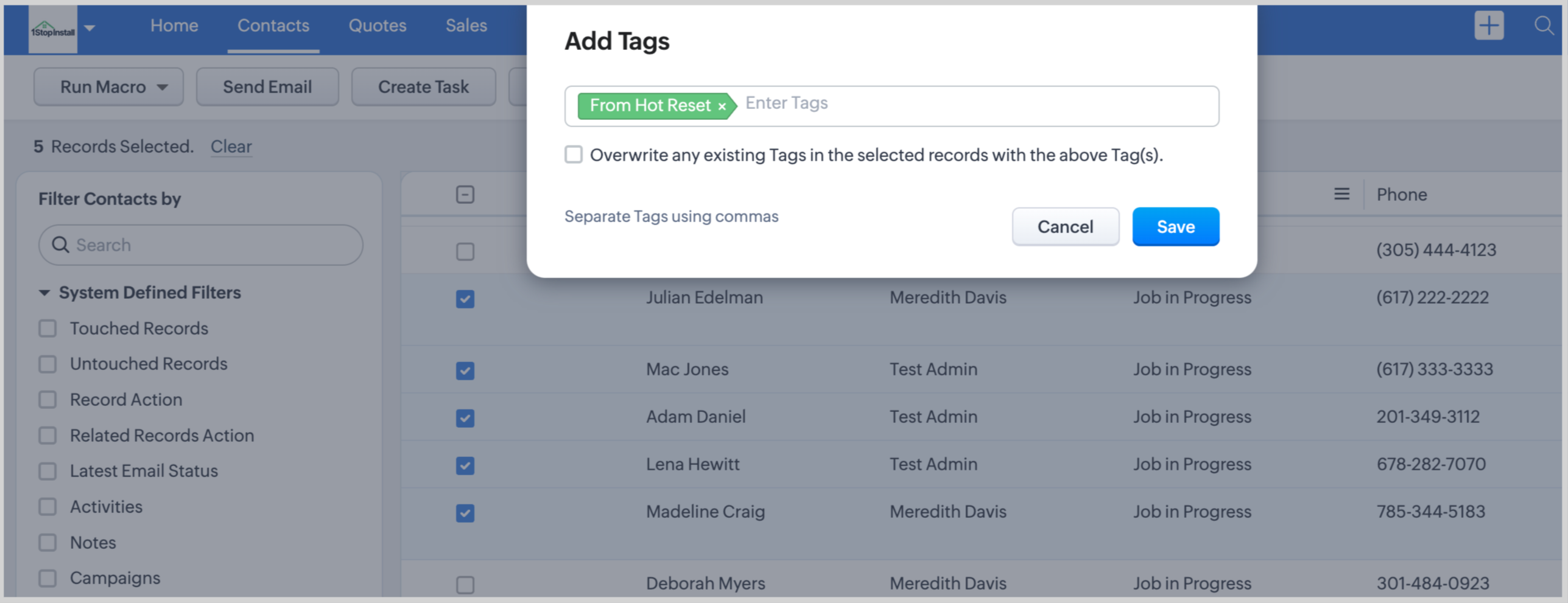 4. Add the Tag/Tags you would like to apply to the record, and click Save.