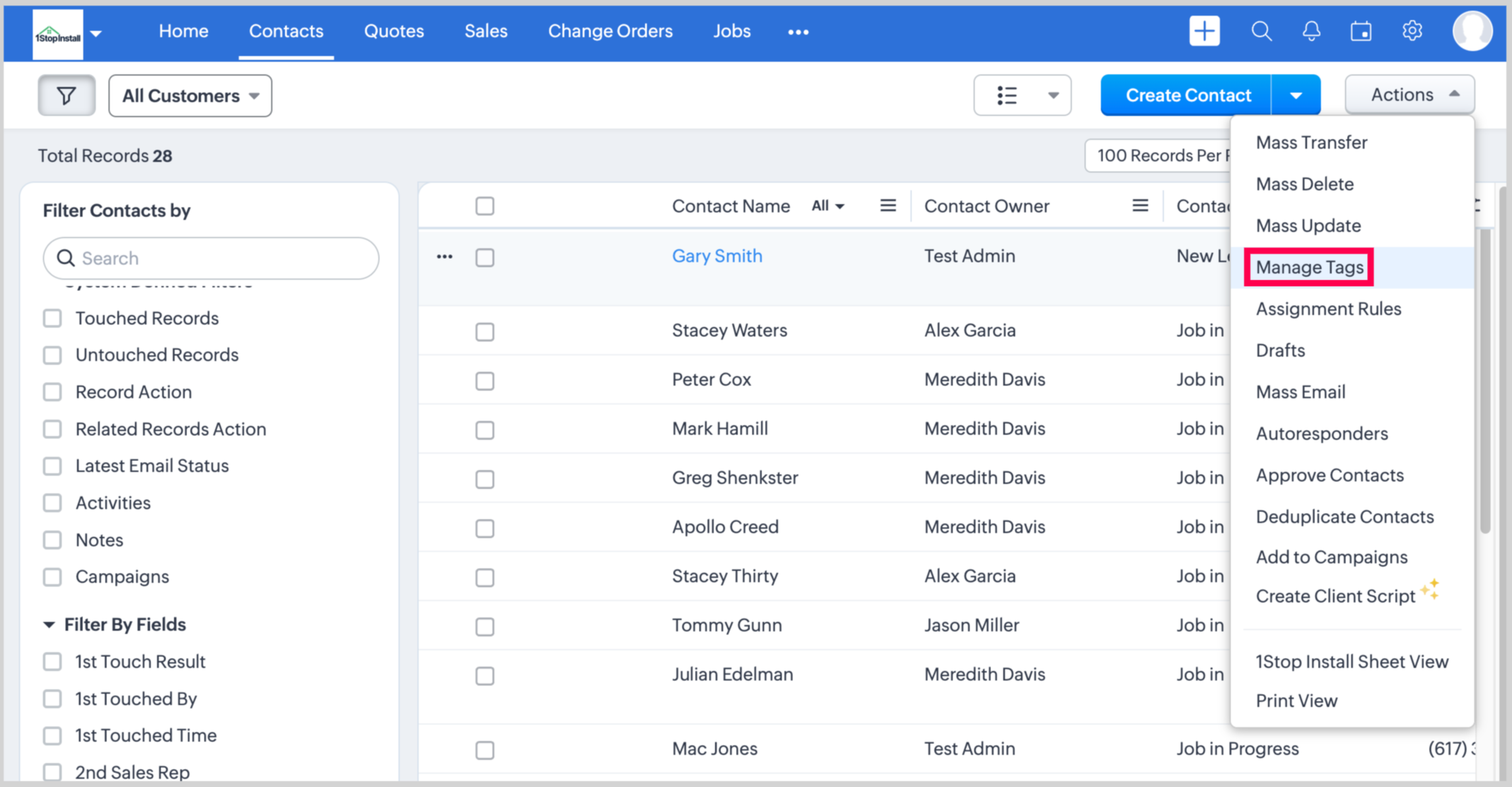 1. Log into 1Stop, and navigate to the module where you intend to add the tag/tags (Contacts, Quotes, Sales, etc.). Once in the module, navigate to the Actions dropbox and click Manage Tags.