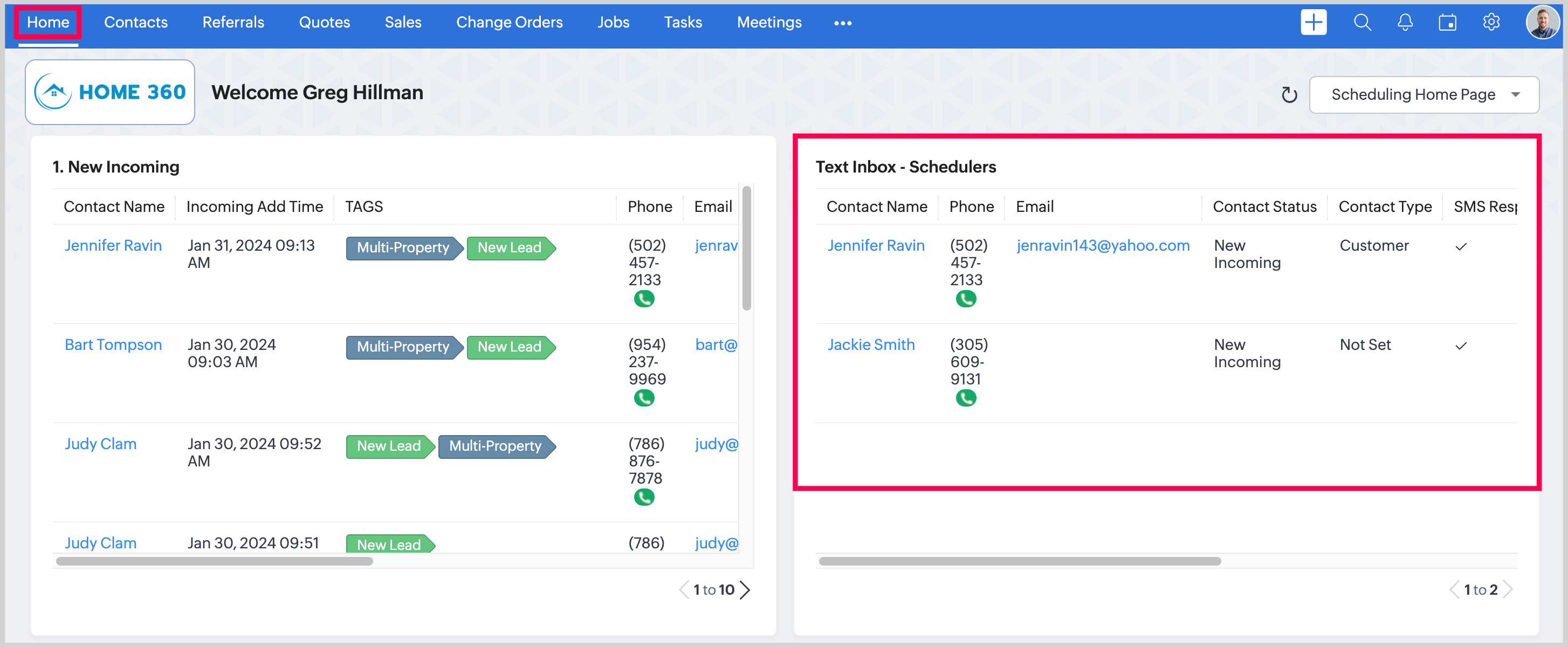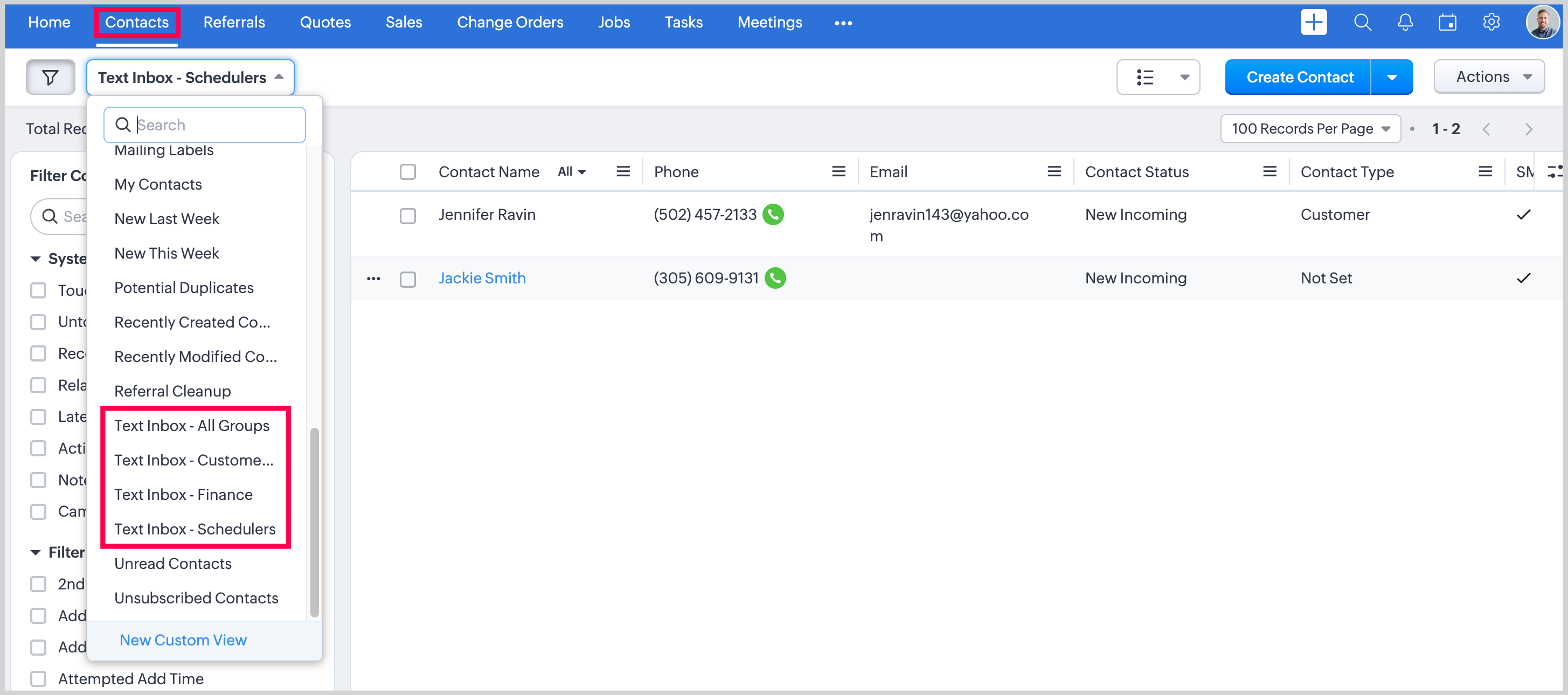 1. In The Contacts Module, scroll down to the Text Inbox Custom View and select the Text Inbox for the User Group you wish to view.