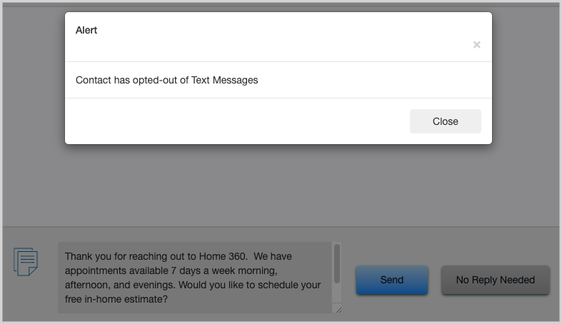 If you see the pop-up message below, the Contact will need to be opted-in to receive text messages. Please follow the instructions.