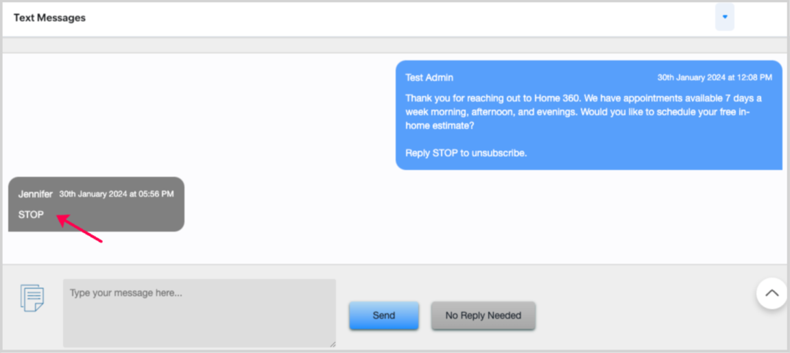 If a Contact replies "STOP" to a text message you send, they will be immediately opted-out of receiving text messages from you, per the below screens.