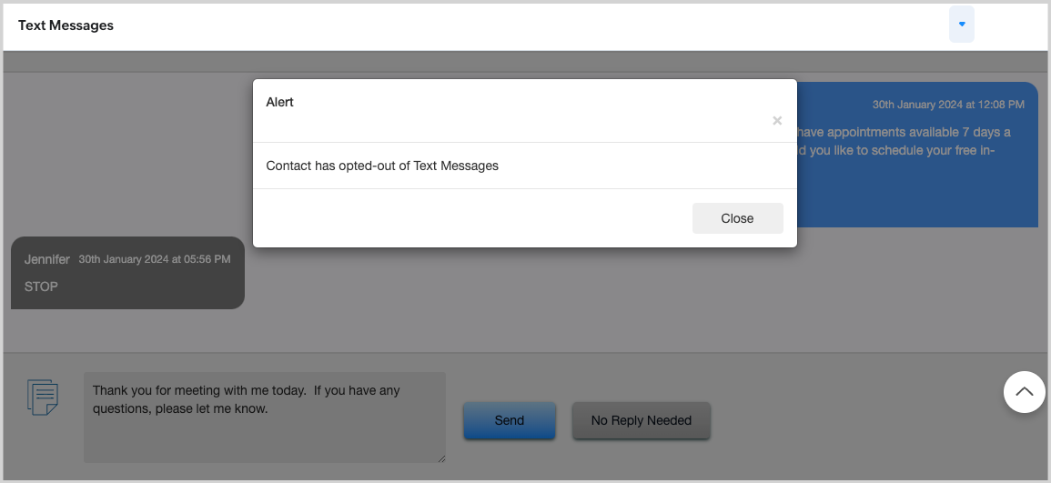 If you an alert appears notifying you that the Contact has opted-out of receiving text messages, see "Opting a Contact In To Receive Text Message"or "Contact Opting Out of Receiving Text Messages below".