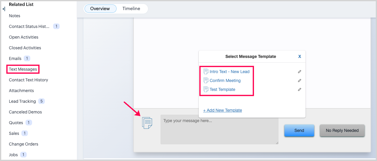 1. From the Contact, navigate to Text Messages using the Related List. Click the Template Button (document icon) and select +Add New Template.