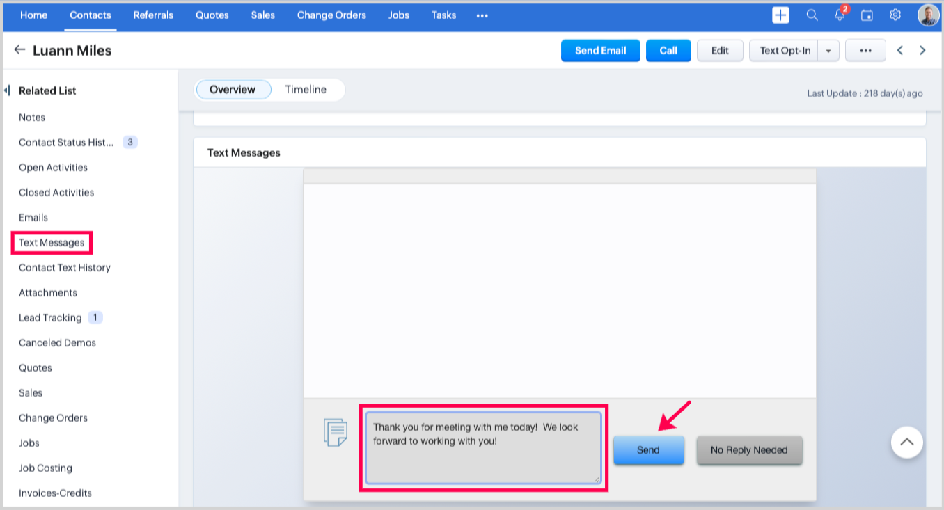 To send a text, click Text Messages in the Related List on the Contact record. Type your message in the gray box, then click Send.