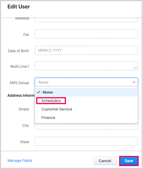 3. In the Edit User screen, scroll down to SMS Group. Choose the group you would like to add the User to, and then click Save.