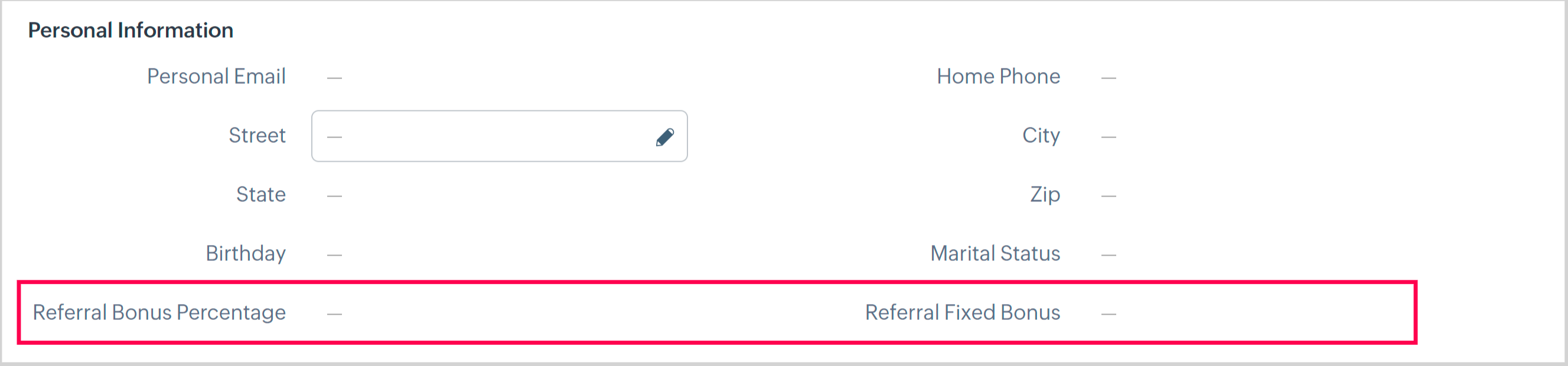 The following fields are located in the Employee's Personal Information section. Once a new Contact they refer or helped generate completes a sale with your company, the fields (if populated) will be copied to the Referral Bonus record associated with the Employee.